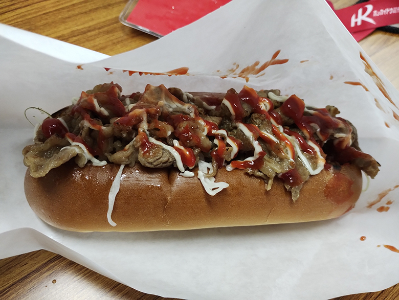 それはともかく、シシリアンライスのホットドッグ版が「シシリアンドッグ」ってことなのね。コッペパンはお皿より収容面積と体積が少ないので、野菜はキャベツの千切りが主なところ。その上に炒めた豚肉が乗っています。この日は店長がわりとサービス気味に盛り付けていましたが、これは「うまてなし」の一環と考えていいのかな?