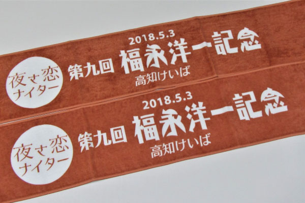 5月3日に高知競馬場で行なわれた「第9回福永洋一記念」のオリジナルマフラータオルを、高知県競馬組合様のご厚意でご提供いただきましたので、ファンの方10名様にプレゼントいたします。