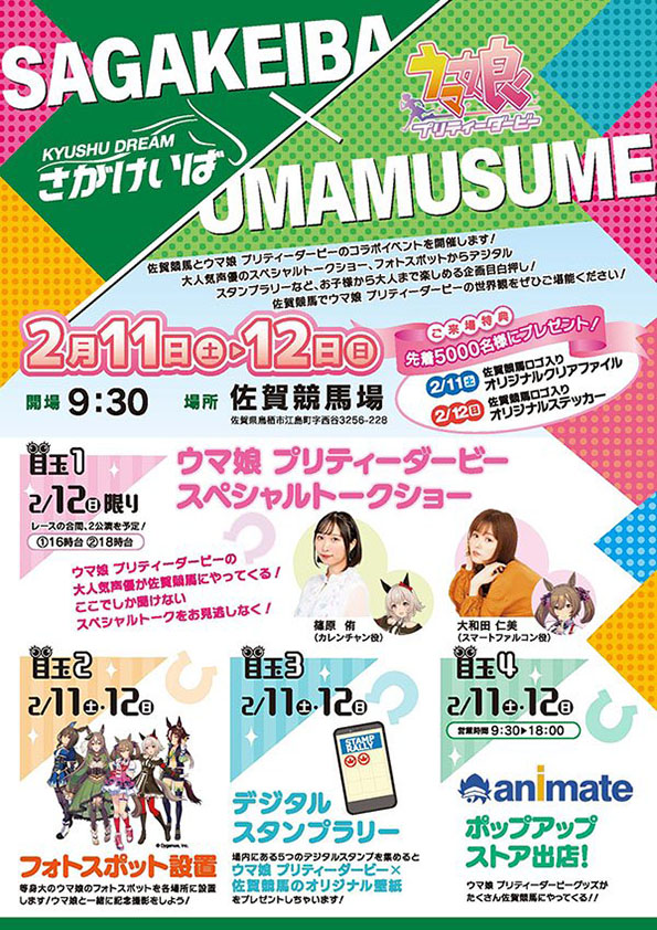 2月11日(土)・12日(日)に佐賀競馬場で、スマートフォン向けゲームアプリ「ウマ娘 プリティーダービー」とのコラボイベントが実施されます。イベントの概要については下記の通りです。