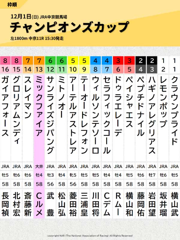 12月1日(日)にJRA中京競馬場で行われるチャンピオンズカップ(GI)の枠順が確定しました。 地方競馬からは、C.ルメール騎手(JRA)騎乗のミックファイア(牡4・大井・渡邉和雄厩舎)が出走予定です。同馬の挑戦にぜひご注目ください。 ミックファイア(ジャパンダートダービー) ■チャンピオンズカップ(GI)の出馬表はこちら(JRA公式ホームページ)